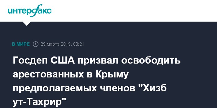 Москва. 29 марта. INTERFAX.RU - Госдепартамент США осудил действия России по задержанию 23 жителей Крыма, подозреваемых в участии в запрещенной в РФ организации "Хизб ут-Тахрир".