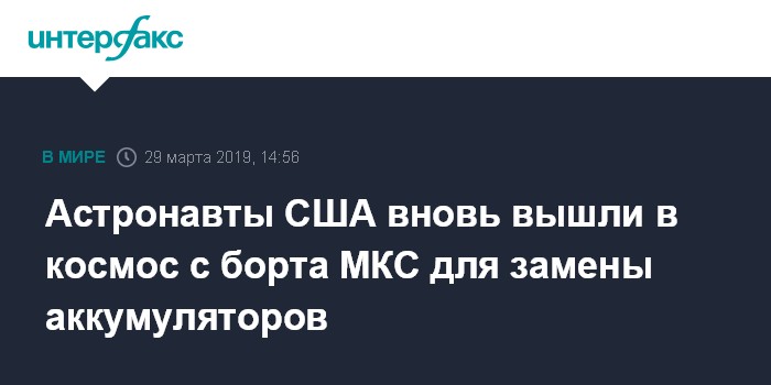 Первый в истории выход в космос двух женщин отменили из-за неподходящего скафандраЧитать подробнееПервоначально НАСА планировало, что 29 марта будет совершен первый в истории выход в открытый космос с МКС с участием одних только женщин-астронавтов - американок Энн Макклейн и Кристины Кох для продолжения монтажа новых ультраёмких аккумуляторов для солнечных панелей станции.