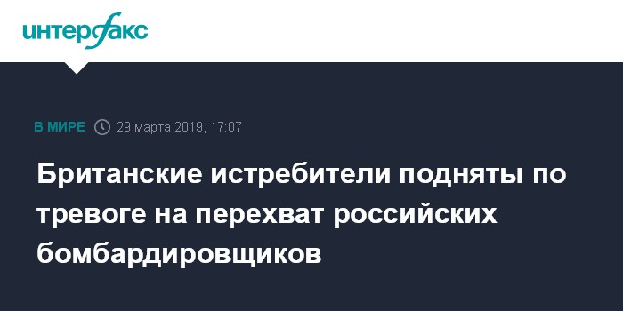Москва. 29 марта. INTERFAX.RU - Два истребителя дежурных сил британских королевских ВВС "Торнадо" в пятницу вылетели с авиабазы "Лоссимут" в Шотландии для идентификации и сопровождения российских бомбардировщиков, выполнявших полет над Северным морем, следует из мониторинговых данных западных авиадиспетчерских служб.