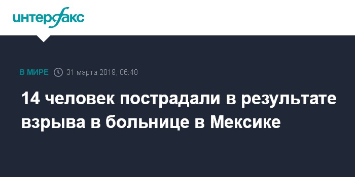 Москва. 31 марта. INTERFAX.RU - Не менее 14 человек пострадали в субботу при взрыве в частной клинике в районе Венустиано-Карранса в Мехико. Об этом сообщила газета El Universal.
