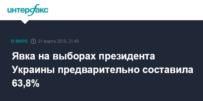 Москва. 31 марта. INTERFAX.RU - Явка избирателей на выборах президента Украины по состоянию на момент завершения голосования в 20:00 воскресенья составила 63,81% по данным 83 избирательных округов по всей стране, сообщается на табло Центральной избирательной комиссии Украины.