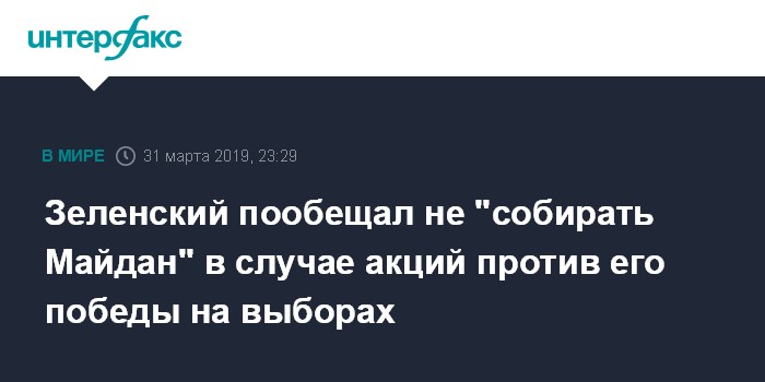 Москва. 31 марта. INTERFAX.RU - Кандидат в президенты Украины, шоумен Владимир Зеленский заявил, что не намерен противодействовать украинцам и организовывать массовые акции, если в случае его победы на президентских выборах часть общества выйдет на протесты.