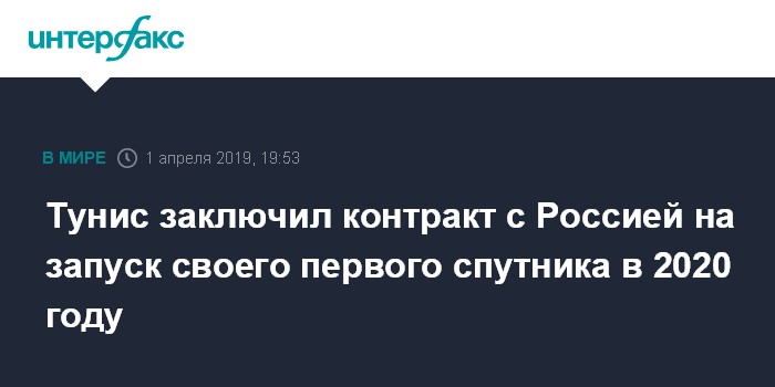 "Контракт на запуск первого спутника Туниса "Challenge ONE" TELNETGroup и GKLaunchServices ("Главкосмос пусковые услуги") подписали контракт на запуск первого спутника Туниса "Challenge ONE" на борту российской ракеты "Союз-2.1а" с разгонным блоком "Фрегат" в 2020 году", - сообщили в госкорпорации.