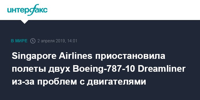 Москва. 2 апреля. INTERFAX.RU - Сингапурская авиакомпания Singapore Airlines приостановила эксплуатацию двух своих самолетов Boeing-787-10 Dreamliner, сообщает телеканал Channel News Asia.