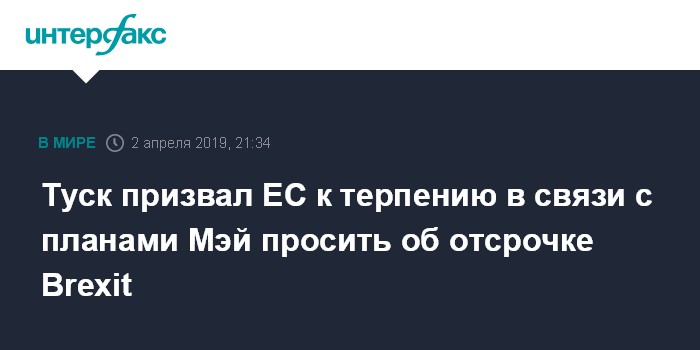 Москва. 2 апреля. INTERFAX.RU - Председатель Европейского совета Дональд Туск во вторник призвал коллег по ЕС проявить терпение после высказываний главы британского парламента Терезы Мэй, которая заявила о намерении попросить Брюссель о еще одной небольшой отсрочке Brexit.