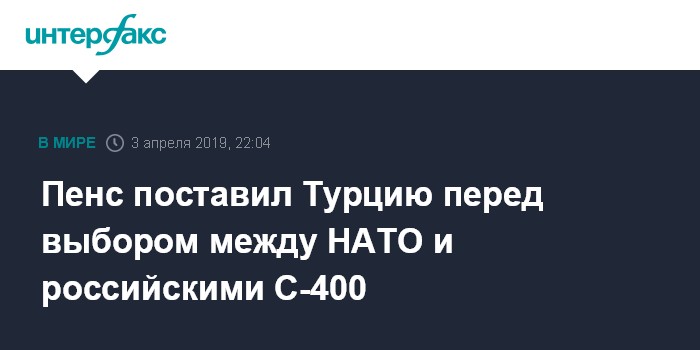 "Приобретение Турцией за $2,5 млрд систем ПВО С-400 у России представляет серьезную угрозу НАТО и силе этого альянса. Сам факт, что Турция продвигается с реализацией этого плана даже после того, как Соединенные Штаты сделали доступными (для Турции - ИФ) системы ПРО Patriot, вызывает глубокую обеспокоенность", - сказал Пенс.