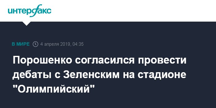 Позднее Зеленский написал обращение и опубликовал видеоролик, в котором подтвердил готовность прийти на дебаты с Порошенко при условии, что они будут проходить на НСК "Олимпийский". Однако в пресс-службе стадиона сообщили, что Государственному предприятию НСК "Олимпийский" пока не поступало никаких официальных заявок или проектов соглашений на проведение дебатов между кандидатами в президенты Украины.