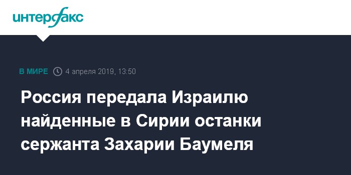 Москва. 4 апреля. INTERFAX.RU - Россия передала Израилю останки погибшего во время Первой ливанской войны в 1982 году военнослужащего танкового батальона Израиля Захарии Баумеля, сообщили в министерстве обороны России.