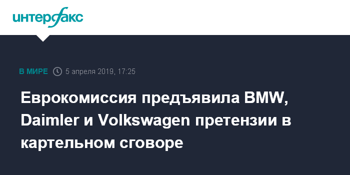 Москва. 5 апреля. INTERFAX.RU - Европейская комиссия пришла к предварительному заключению, что немецкие автопроизводители BMW, Daimler и Volkswagen (бренды Volkswagen, Audi и Porsche) состояли в сговоре с целью ограничения развития и внедрения технологий снижения выбросов вредных веществ в автомобилях как с дизельными, так и с бензиновыми двигателями.
