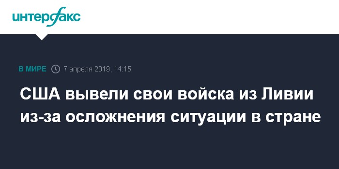 Москва. 7 апреля. INTERFAX.RU - Африканское командование ВС США (AFRICOM) вывело свой контингент из Ливии в связи с ухудшением ситуации с безопасностью в стране, охарактеризовав этот шаг как "разумное военное планирование".