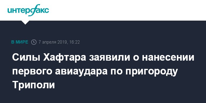 Москва. 7 апреля. INTERFAX.RU - Ливийская национальная армия (ЛНА) под командованием маршала Халифы Хафтара заявила, что в воскресенье она нанесла первый воздушный удар по пригороду Триполи, передают западные СМИ.