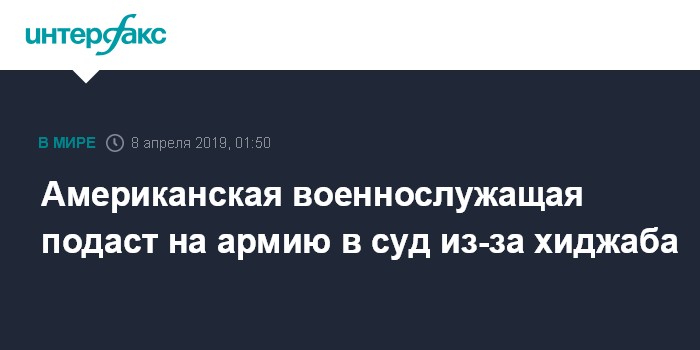 Москва. 8 апреля. INTERFAX.RU - Ветеран американской армии, сержант Сесилия Валдовинос вместе с адвокатом Майки Вайнштейном подаст в суд на вооруженные силы из-за отношения к хиджабу, сообщил телеканал ABC News.
