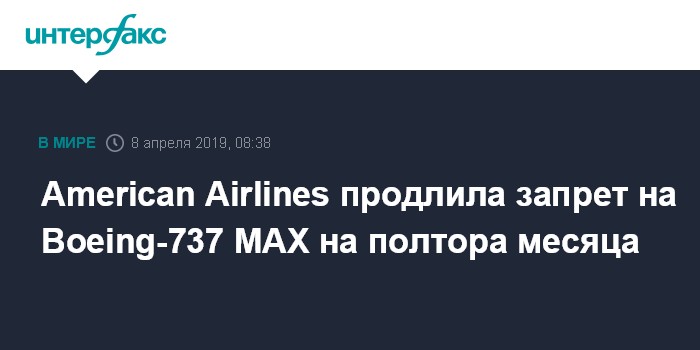 Москва. 8 апреля. INTERFAX.RU - Американская авиакомпания American Airlines объявила, что продлевает срок отказа от использования самолетов Boeing-737 MAX до 5 июня вместо планировавшегося ранее 24 апреля.