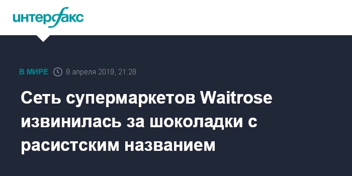 Москва. 9 апреля. INTERFAX.RU - Сеть супермаркетов Waitrose в Великобритании извинилась за выпуск в продажу набора шоколадных уточек к Пасхе, названия которых покупатели сочли расистскими, сообщает во вторник телеканал Sky News.