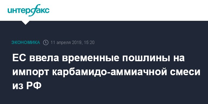 Москва. 11 апреля. INTERFAX.RU - Еврокомиссия приняла решение ввести предварительные пошлины на импорт карбамидо-аммиачной смеси (КАС) из России в размере 31,9% для "Акрона", 34% - для "ЕвроХима" и остальных производителей, следует из материалов регулятора.