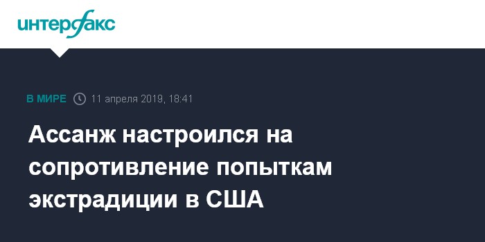 Москва. 11 апреля. INTERFAX.RU - Основатель WikiLeaks Джулиан Ассанж намерен противостоять попытке экстрадировать его в США, сообщает в четверг Bloomberg.