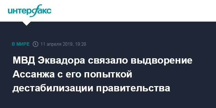 "Министр внутренних дел Эквадора Мария Паула Ромо заявила, что Эквадор отозвал решение о предоставлении убежища Джулиану Ассанжу, поскольку располагает вескими доказательствами того, что он вмешивался во внутренние дела Эквадора с целью дестабилизировать правительство", - цитирует телеканал CNN ее высказывания.