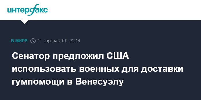 Москва. 11 апреля. INTERFAX.RU - Американский сенатор Рик Скотт предложил использовать американские вооруженные силы для того, чтобы обеспечить доставку гуманитарной помощи в Венесуэлу, сообщает в четверг газета The Miami Herald.