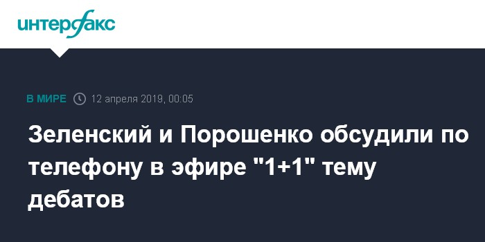 Москва. 12 апреля. INTERFAX.RU - Кандидаты в президенты Украины Владимир Зеленский и Петр Порошенко обсудили в прямом эфире программы "Право на власть" на телеканале "1+1" тему проведения предвыборных дебатов, что сопровождалось определенной перепалкой между ними.