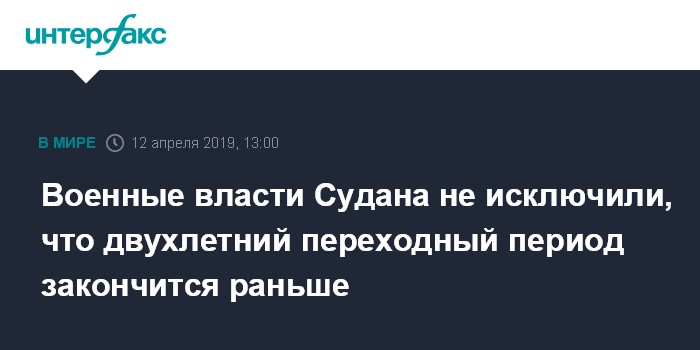 Москва. 12 апреля. INTERFAX.RU - Объявленный военными властями Судана двухлетний переходный период может окончиться раньше срока в случае готовности народа принять участие в политической жизни страны, заявил в пятницу глава политического комитета военных властей Судана Омар Зейн аль-Абедин.