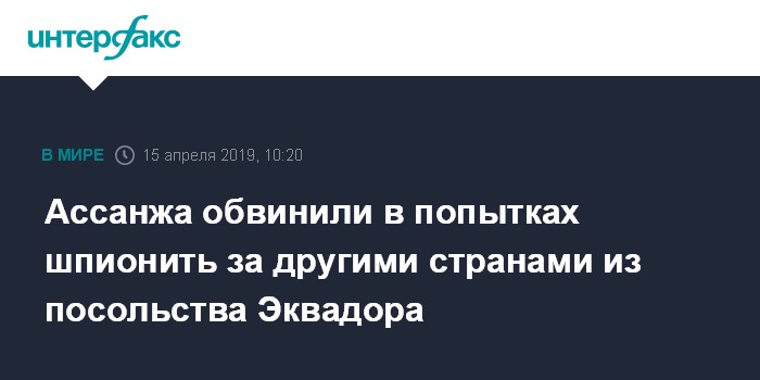 Москва. 15 апреля. INTERFAX.RU - Основатель WikiLeaks Джулиан Ассанж пытался использовать посольство Эквадора в Лондоне в качестве центра для шпионажа и вмешательства в дела других государств, заявил эквадорский президент Ленин Морено.