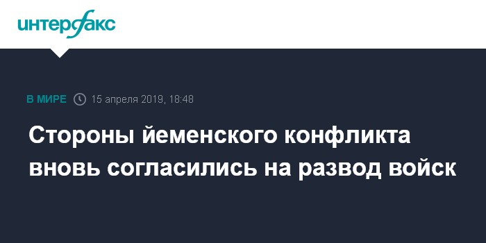 Москва. 15 апреля. INTERFAX.RU - Правительство Йемена и повстанцы-хуситы вновь договорились о взаимном отводе войск от портового города Ходейда в качестве первого этапа стабилизации ситуации в этом районе, заявил в понедельник спецпосланник ООН по Йемену Мартин Гриффитс.