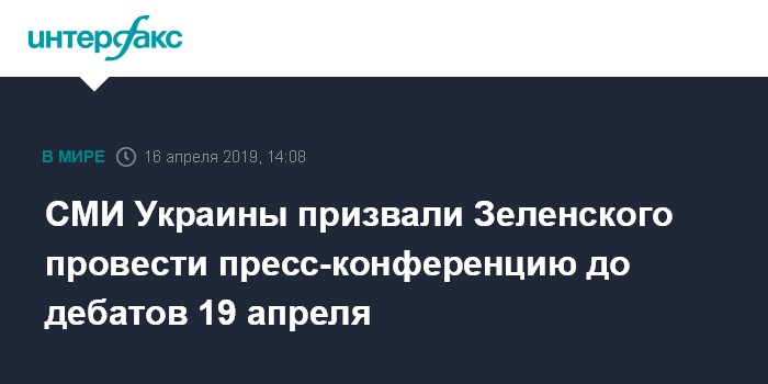 Москва. 16 апреля. INTERFAX.RU - Представители средств массовой информации и медийных организаций Украины опубликовали открытое обращение к кандидату в президенты Владимиру Зеленскому с призывом выйти на пресс-конференцию не позднее 18 апреля, то есть до официальной даты дебатов (19 апреля).