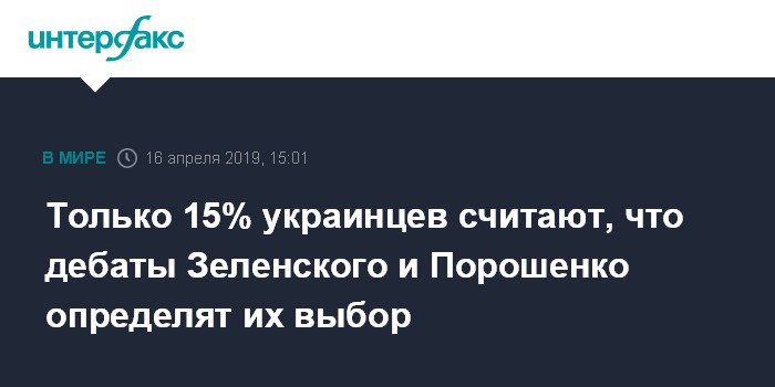 Москва. 16 апреля. INTERFAX.RU - Дебаты между кандидатами в президенты Украины Владимиром Зеленским и Петром Порошенко будут определяющими при принятии решения на голосовании для 14,9% украинцев, сообщает Киевский международный институт социологии (КМИС).