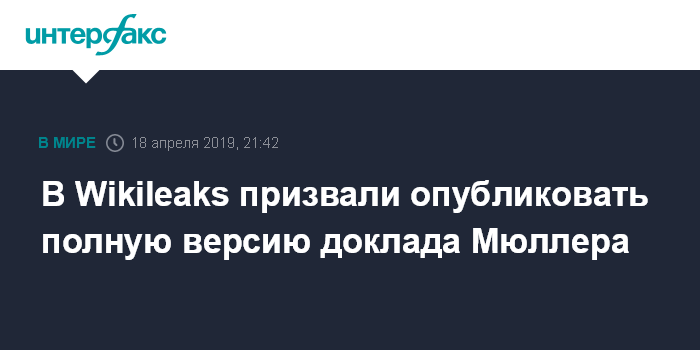 Москва. 18 апреля. INTERFAX.RU - В Wikileaks в четверг призвали Минюст США обнародовать полную версию доклада спецпрокурора США Роберта Мюллера по итогам расследования о возможном сговоре предвыборного штаба президента США Дональда Трампа с Россией.