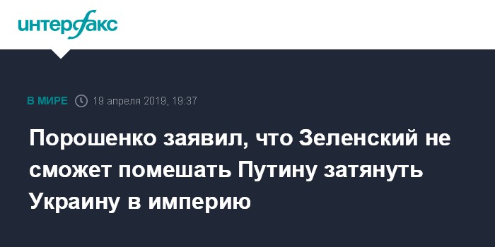 Москва. 19 апреля. INTERFAX.RU - Кандидат в президенты Украины Петр Порошенко считает, что его оппонент Владимир Зеленский будет слабым президентом и не сможет противостоять риску возвращения Украины в "Российскую империю".