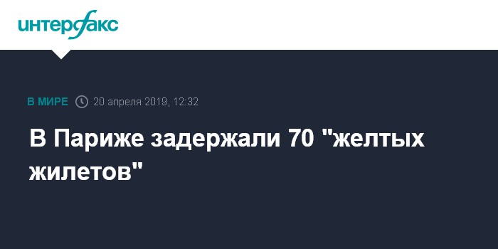 Москва. 20 апреля. INTERFAX.RU - Парижская полиция задержала 70 человек на акциях, организованных утром в субботу "желтыми жилетами", сообщает телеканал BFM TV со ссылкой на полицию.