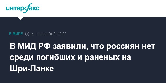 Москва. 21 апреля. INTERFAX.RU - Россиян нет среди погибших и пострадавших в результате серии взрывов на Шри-Ланке, сообщила в воскресенье официальный представитель МИД РФ Мария Захарова.