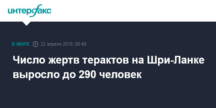 Москва. 22 апреля. INTERFAX.RU - Число погибших в результате взрывов на Шри-Ланке достигло 290 человек, сообщает CNN со ссылкой на представителя местной полиции.