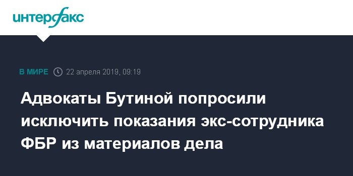 Москва. 22 апреля. INTERFAX.RU - Команда защиты россиянки Марии Бутиной просит суд исключить из материалов дела экспертную оценку и показания бывшего сотрудника ФБР Роберта Андерсона, по мнению которого, все ее действия происходили "от лица российских властей".