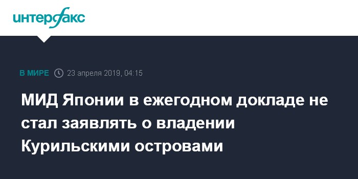 Москва. 23 апреля. INTERFAX.RU - Министерство иностранных дел Японии в ежегодном докладе о внешней политике "Синяя книга по дипломатии" не стало, как ранее прямо заявлять, что спорные Курильские острова принадлежат стране, сообщает The Mainichi.
