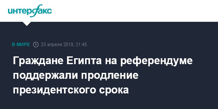 Москва. 23 апреля. INTERFAX.RU - Граждане Египта на референдуме одобрили поправки к конституции страны, которые увеличивают президентский срок, сообщает во вторник египетская газета "Аль-Ахрам" со ссылкой на избирательную комиссию страны.