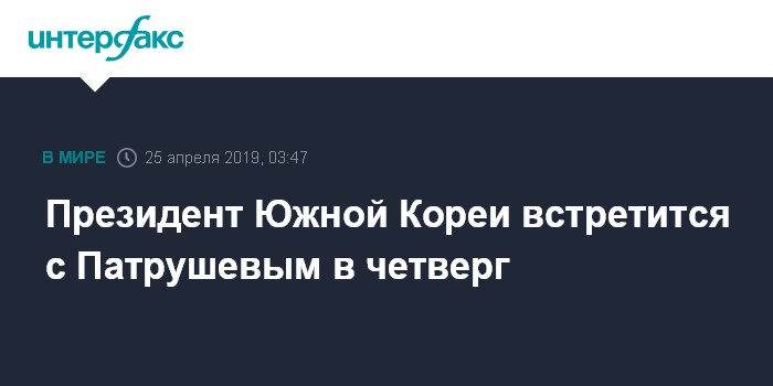 Москва. 25 апреля. INTERFAX.RU - Президент Республики Корея Мун Чжэ Ин встретится с секретарем Совета Безопасности России Николаем Патрушевым в четверг, сообщает администрация главы Южной Кореи.