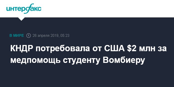 Москва. 26 апреля. INTERFAX.RU - Северная Корея выставила счет США на $ 2 млн за медицинскую помощь студенту Отто Вомбиеру, задержанному в Пхеньяне в 2016 году, впавшему в кому и в 2017 году скончавшемуся в Соединенных Штатах, сообщает Washington Post.