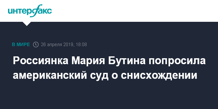 Москва. 26 апреля. INTERFAX.RU - Россиянка Мария Бутина в пятницу обратилась к суду американского округа Колумбия с просьбой проявить снисхождение при вынесении приговора.