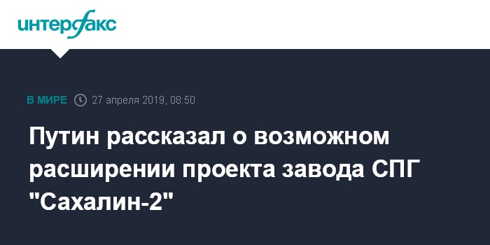 Москва. 27 апреля. INTERFAX.RU - Российская Федерация рассматривает возможность по расширению проекта по сжижению газа на Дальнем Востоке "Сахалин-2", заявил Владимир Путин, выступая на круглом столе Второго международного форума "Один пояс, один путь" в Пекине.