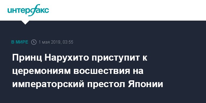 Москва. 1 мая. INTERFAX.RU - 59-летний принц Нарухито - старший сын отрекшегося накануне 125-го императора Японии Акихито - в среду приступит к церемониям, сопровождающим его восхождение на императорский трон Японии.