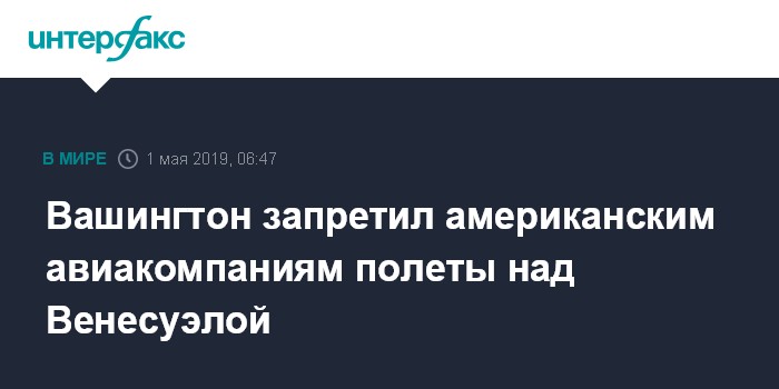 Москва. 1 мая. INTERFAX.RU - Федеральное управление гражданской авиации США (FAA) запретило американским авиакомпаниям летать над Венесуэлой и предписало их операторам покинуть страну в течение 48 часов