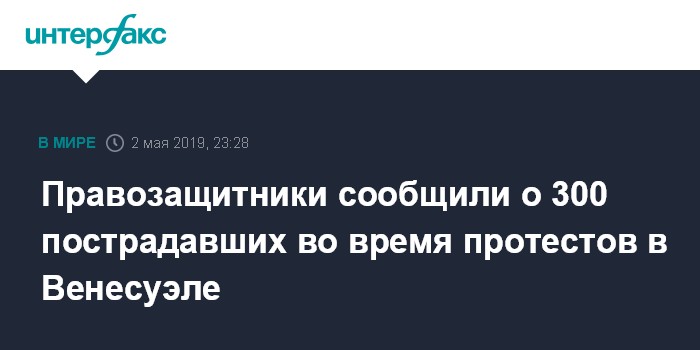 Москва. 2 мая. INTERFAX.RU - Более 300 человек пострадали в результате столкновений во время протестов в Венесуэле, сообщил в четверг глава НПО "Венесуэльский уголовный форум" Альфредо Ромеро.