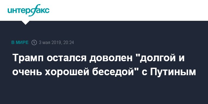 Москва. 3 мая. INTERFAX.RU - Президент США Дональд Трамп в пятницу заявил, что доволен разговором с российским президентом Владимиром Путиным.