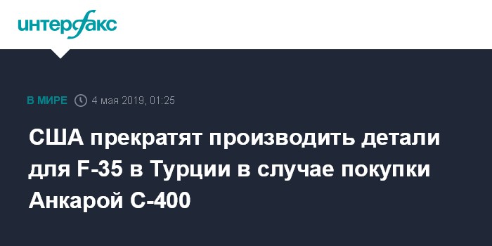 Москва. 4 мая. INTERFAX.RU - Власти США должны будут перенести производство ряда деталей истребителей-бомбардировщиков F-35 из Турции, если эта страна не откажется от покупки российских зенитных ракетных систем С-400, заявил и.о. главы Пентагона Патрик Шанахан.