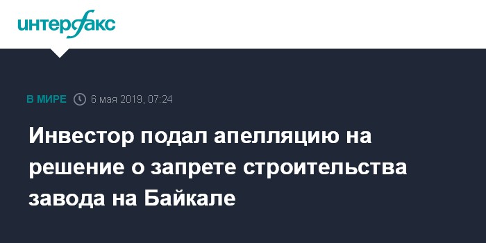Москва. 6 мая. INTERFAX.RU - Инвестор завода по розливу воды на берегу Байкала, ООО "АкваСиб", подал апелляционную жалобу в Иркутский областной суд на решение районного суда, который в конце марта аннулировал положительное заключение государственной экологической экспертизы на строительство данного предприятия.