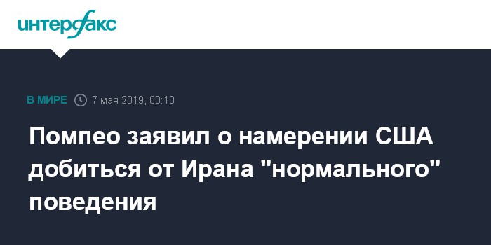 Москва. 7 мая. INTERFAX.RU - Администрация США будет добиваться от Ирана поведения "нормальной страны", заявил в понедельник глава госдепа Майк Помпео.