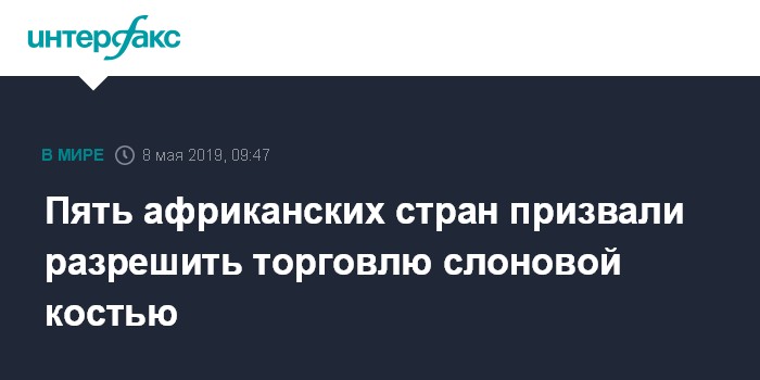 Москва. 8 мая. INTERFAX.RU - Пять стран Африки, на территории которых обитает большая часть популяции слонов, требует разрешения на торговлю слоновой костью, сообщает агентство Bloomberg.