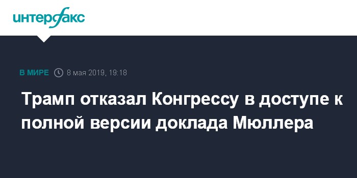 Москва. 8 мая. INTERFAX.RU - Президент США Дональд Трамп заблокировал передачу конгрессу полного текста доклада спецпрокурора Роберта Мюллера по итогам расследования "российского дела", сообщила в среду пресс-секретарь президента Сара Сандерс.