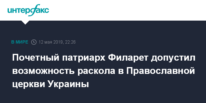 Москва. 12 мая. INTERFAX.RU - Почетный патриарх Киевский и всея Руси-Украины Филарет допускает раскол в православной церкви и утверждает, что уполномочен созывать собор. В комментарии программе новостей, который был обнародован в одном из сюжетов в воскресенье, он сетовал на то, что предстоятель Православной церкви Украины (ПЦУ) митрополит Киевский и всея Украины Епифаний крайне редко с ним общается.